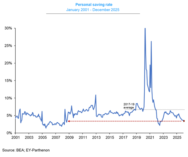 That meant that in 2025 Americans only sustained their consumption needs by running down savings and increasing debt. The personal savings rate fell to 3.6% of income in December, down 1.9pp since April 2025.