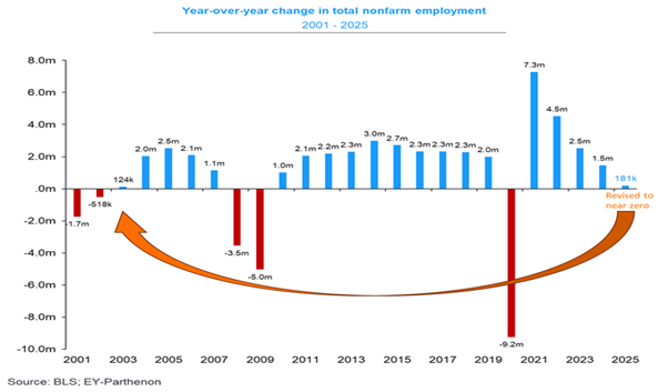 January’s jobs growth figure looked good on the surface, up 130k. But rises in November and December were revised down. More important, there were even larger revisions to 2025 as a whole, which showed that last year was the weakest year of job creation outside of recessions in two decades. The US economy only added 181,000 jobs in 2025, or just 15,000 extra jobs per month.
