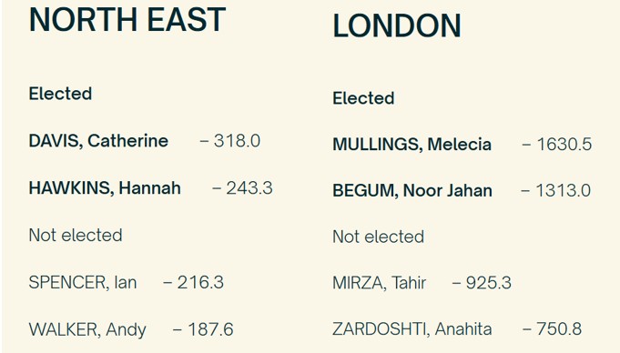 After the complex process of vote transfers, many contests in regions/nations were close and a few regions returned one from each slate, including in London, which has a very large percentage of the total membership. In the South East region, Naomi Wimborne-Idrissi, an independent endorsed by the GL, topped the poll.