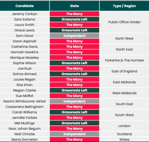 On 26 February, after an ill-tempered process, the results of the elections to the Central Executive Committee (CEC) were finally announced, showing a clear win for the slate around Jeremy Corbyn – “The Many”. Of the twenty four committee posts, 14 went to The Many and 7 to the Grassroots Left (GL) slate supported by Zarah Sultana. Three independents were elected, two of which were endorsed by the Grassroots Left. No less than twenty successful candidates were women!